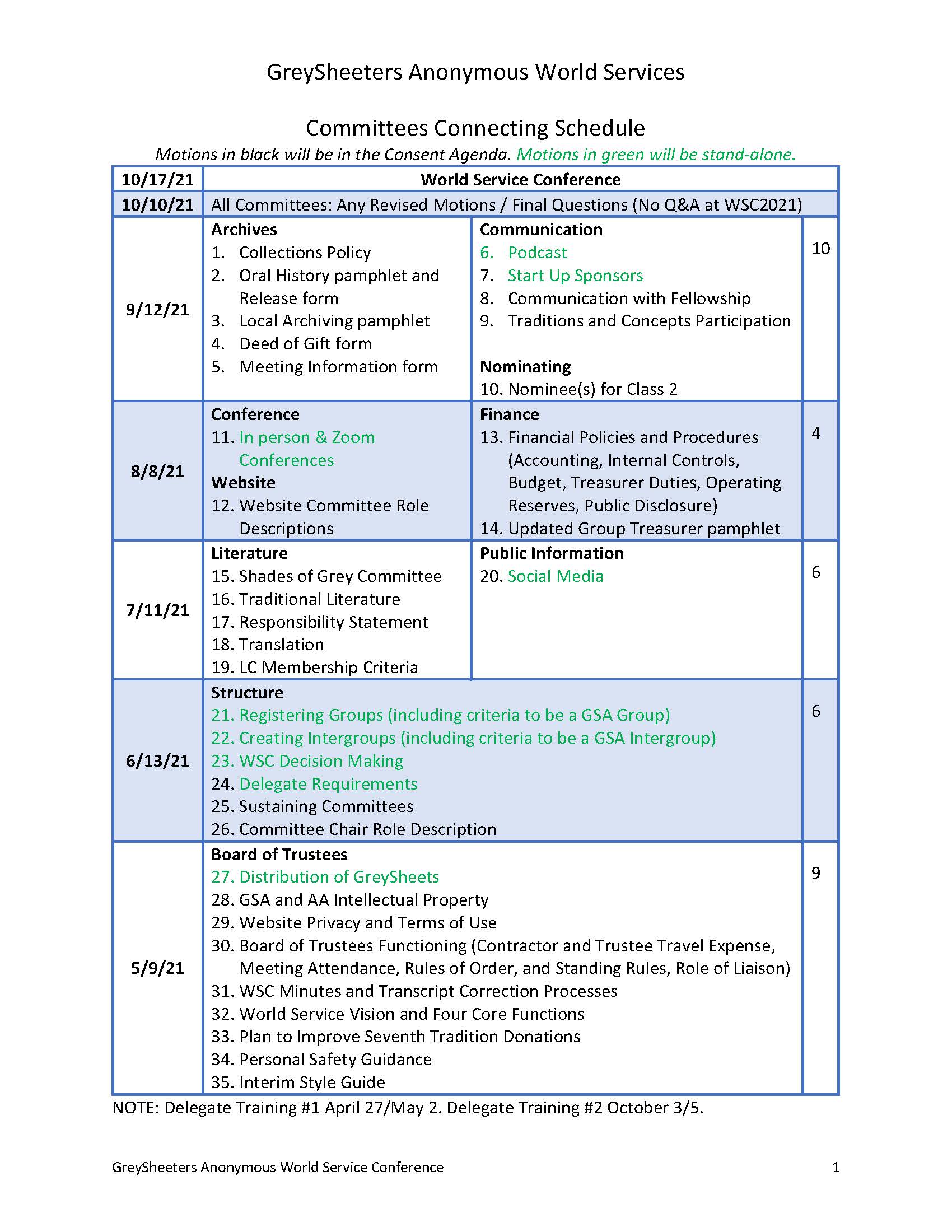 Schedule of motions to be presented by each committee at the 2021 GSA World Service Conference on October 17th.